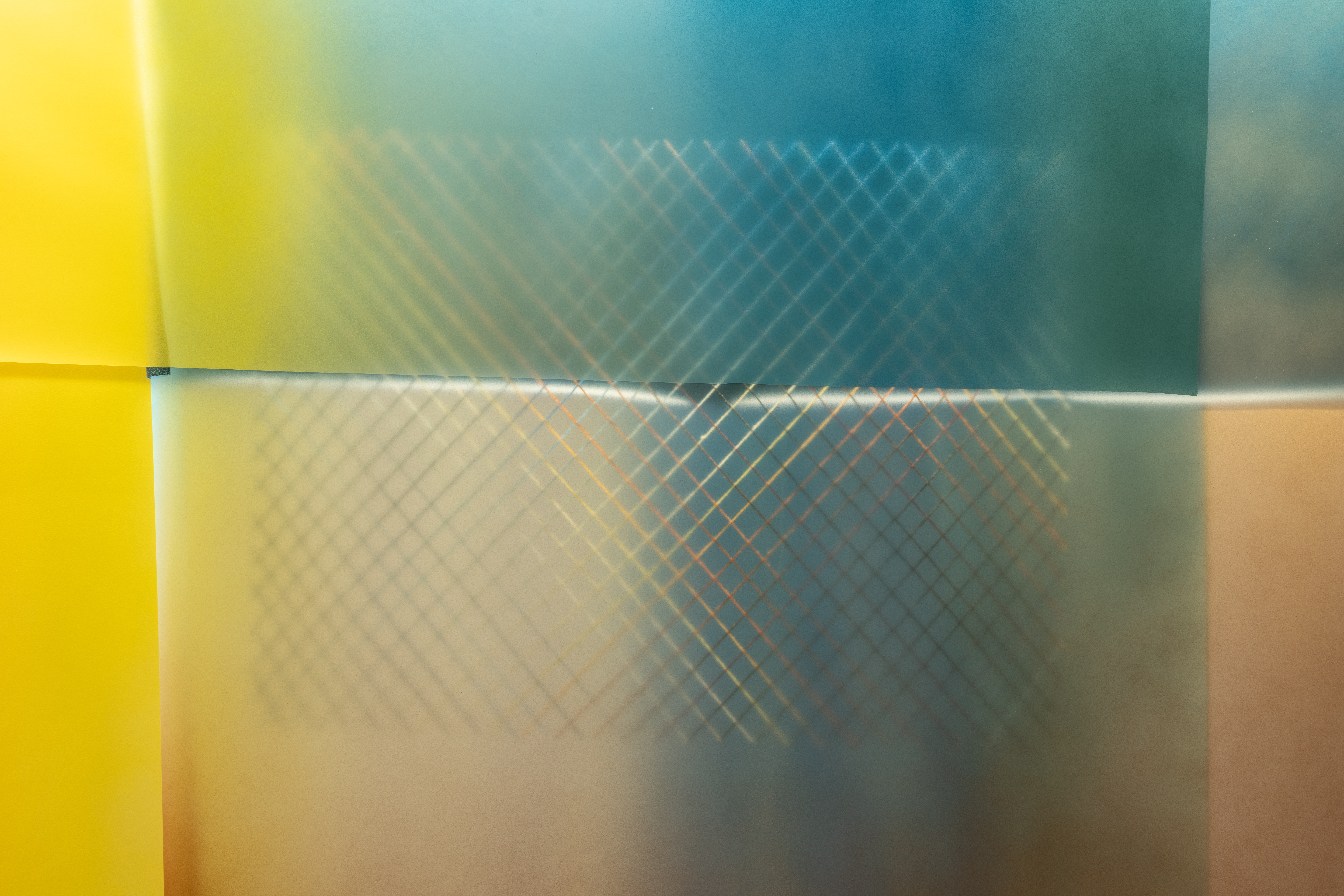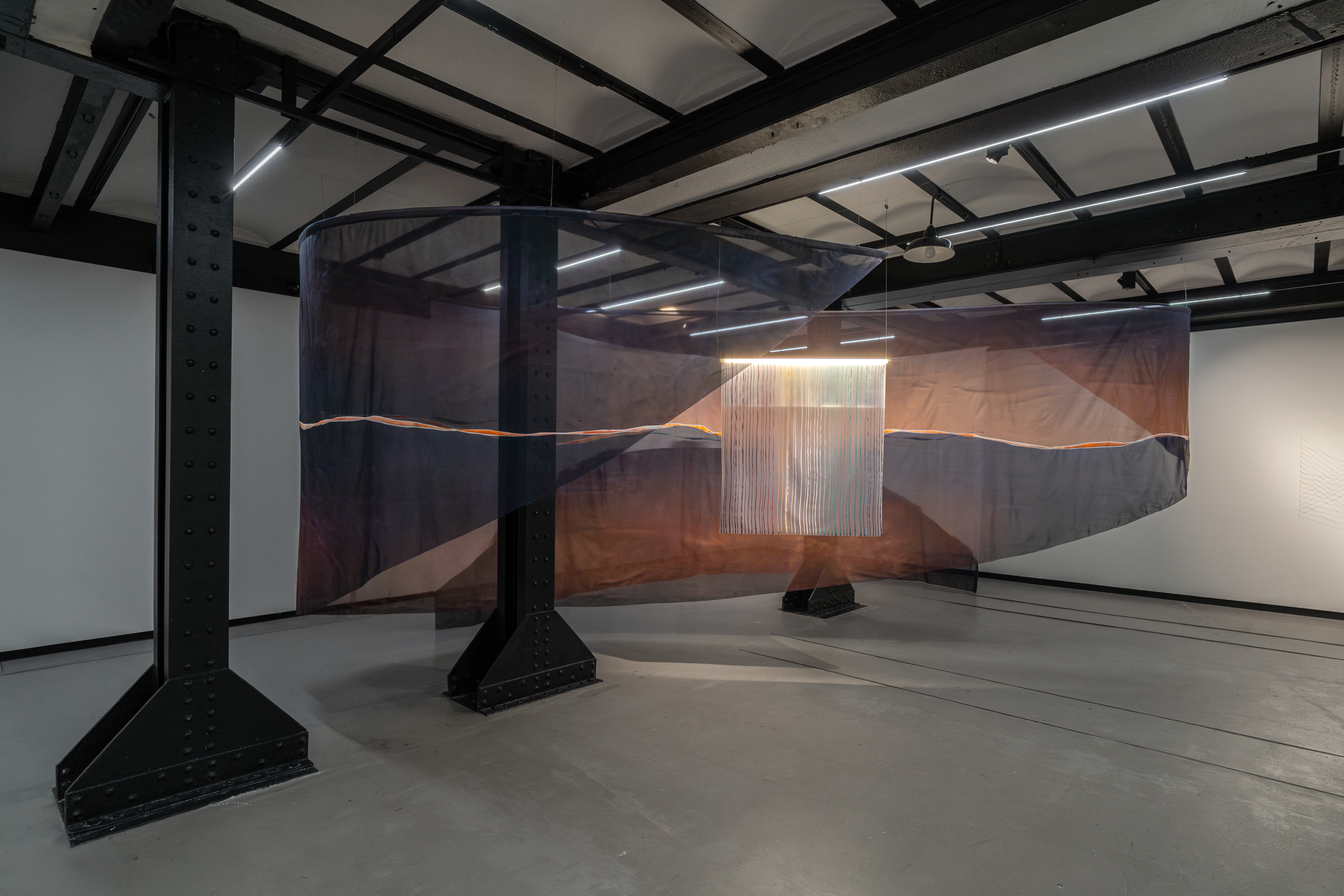 The exhibition brings together for the first time three distinct yet interconnected bodies of work: the skin-paintings of Strangers series, with their vulnerable membrane-like surfaces; the net-paintings of Work in Space, resembling ossified webs suspended between dimensions; and the screen-paintings of I was never, which fragment and multiply the act of seeing itself. Each work embodies not only the unfathomable osmosis of colour but also bears witness to the artist's tenacious gesture of cutting—a deliberate rupture that becomes generative rather than destructive.